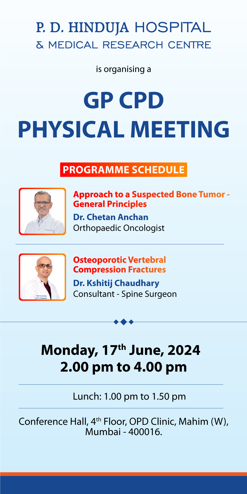 Venue: Conference Hall, 4th Floor, OPD Clinic, P. D. Hinduja Hospital & MRC, Mahim, Mumbai 400016
